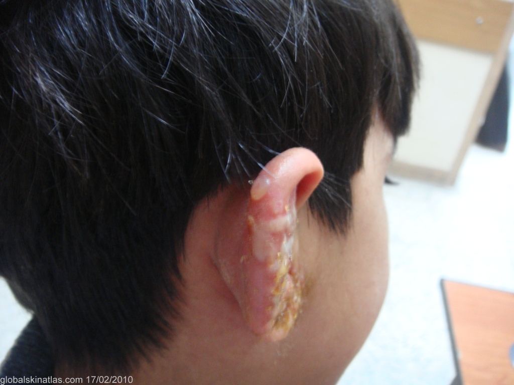Differential DiagnosisHistory: This girl presented with a unilateral vesiculopustular rash involved the right auricle of few days duration. It was associated with an excruciating pain and covered with a honey-colored crustation due to secondary impetiginization.