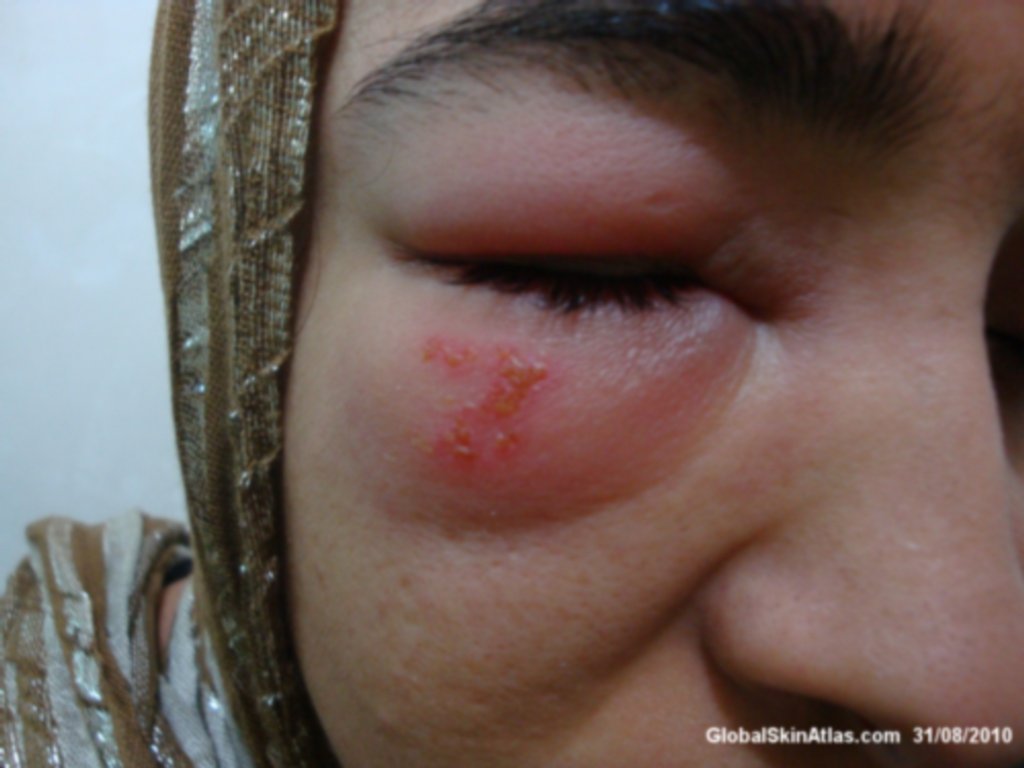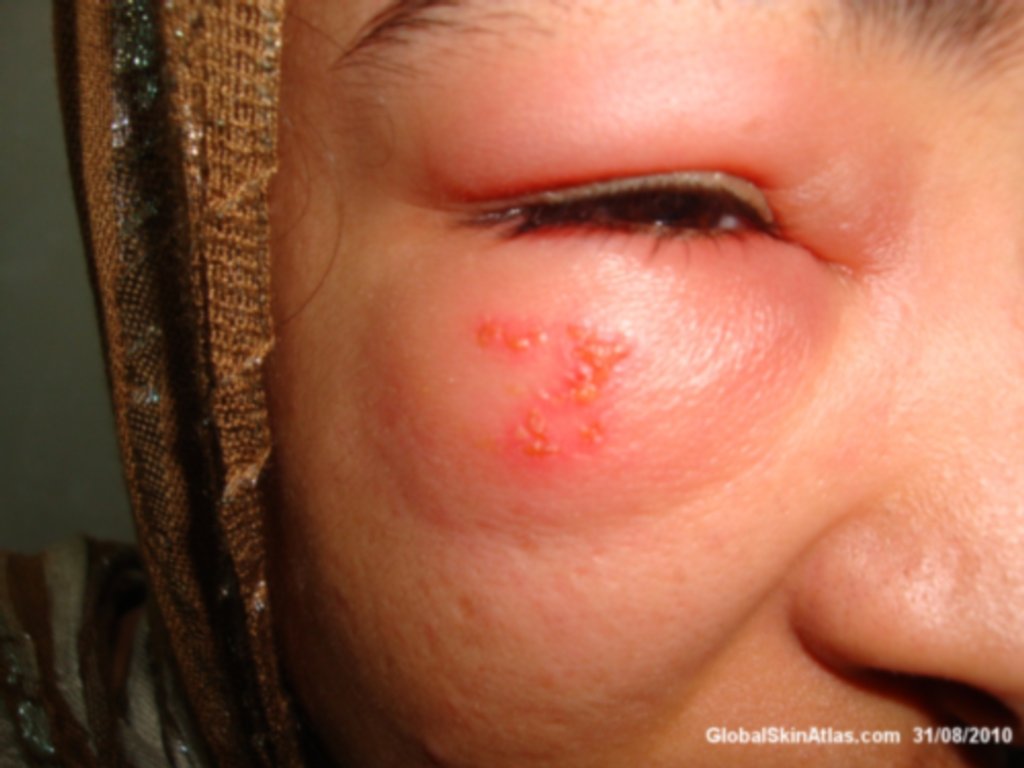 A 20-year-old female presented with painful unilateral grouped vesicles on a swollen  erythematous base involved the right periorbital region of 4 days duration. The right eye was not involved.