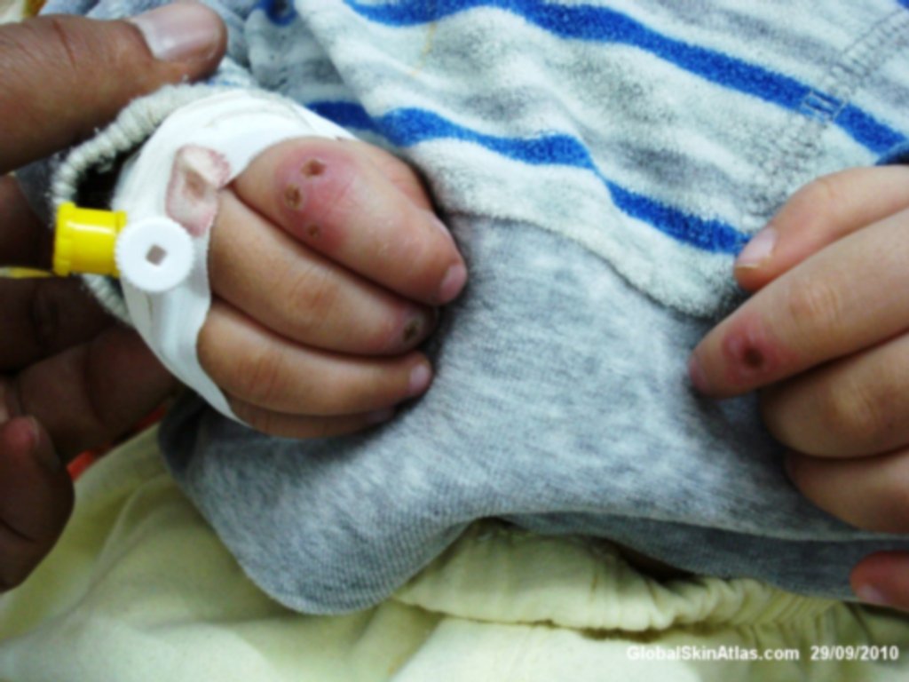 This toddler has had history of atopic dermatitis presented with fever, lassitude and grouped ruptured vesicles covered with honey-colored crusts in the face especially perioral area and scattered similar lesions on fingers of both hands of three days duration.