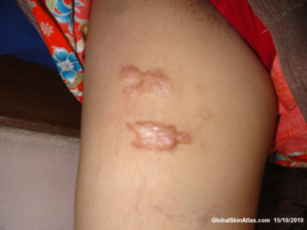 Asymptomatic two keloidal scars with irregular borders on the front of the thigh of two years duration. The lesions developed on apparently normal skin and the patient claimed that there was no history of previous injury or inflammation to the affected area.