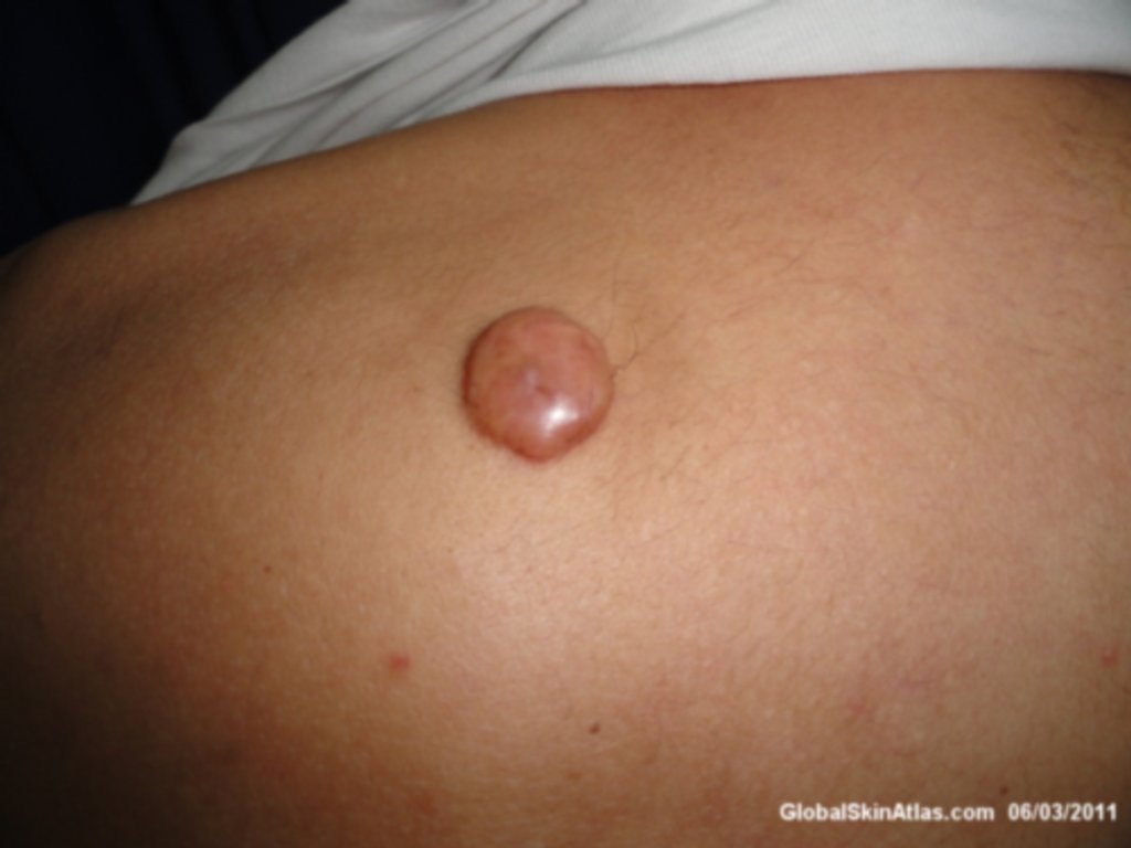 Spontaneously arose asymptomatic, hard, skin-colored nodule 2 cm in diameter on the upper back near the left shoulder of five months duration.