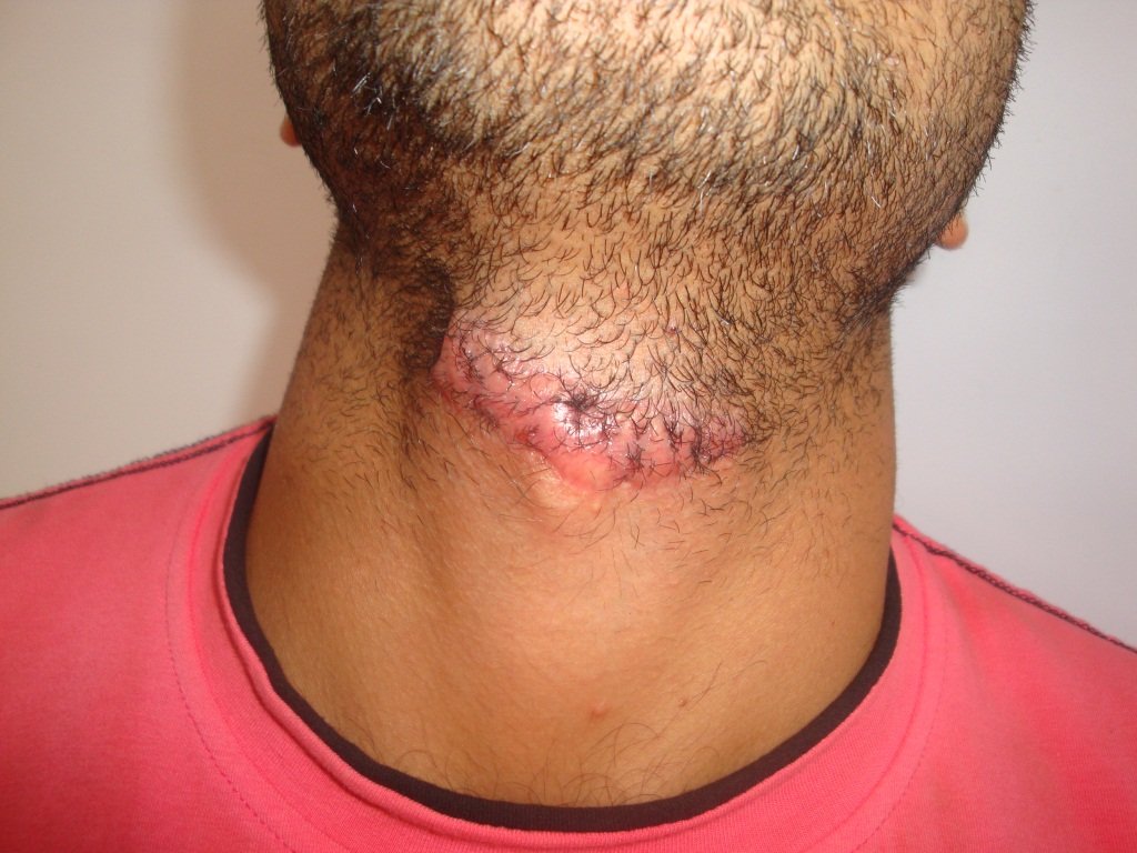 This patient had a few grouped lesions of molluscum contagiosum on the neck of 3-4 weeks duration. The lesions had been removed aggressively through electrocautery by an unexperienced medical substaff person. Few weeks later a large pinkish-red, ugly-looking scar appeared at site of cautery.