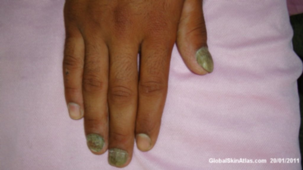 A middle-aged man presented with nail thickening, pitting, subungual hyperkeratosis and roughness involved mainly the fingernails of more than one year duration. Nail clipping for KOH examination was negative and the patient has had positive family history of psoriasis.