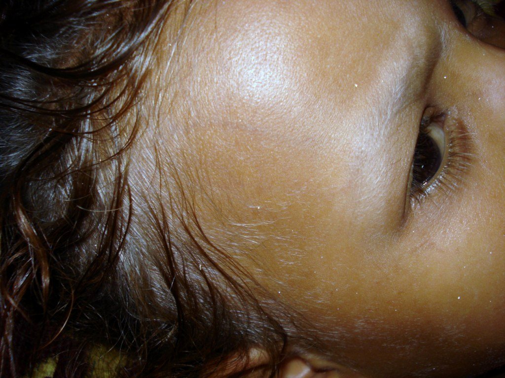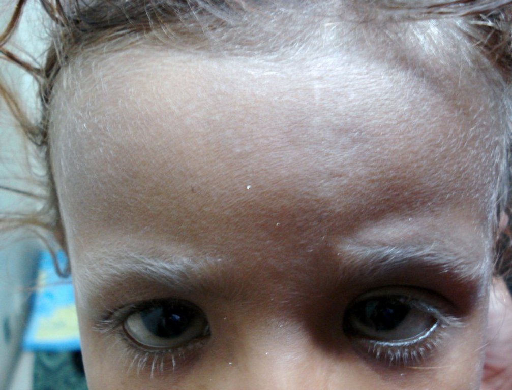 N.B: Thewhite color of the scalp hair was masked by henna (hair dye of plant origin) at time of presentation.