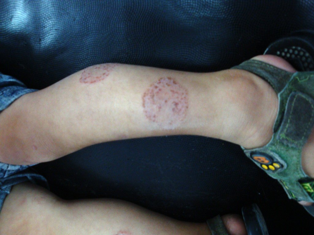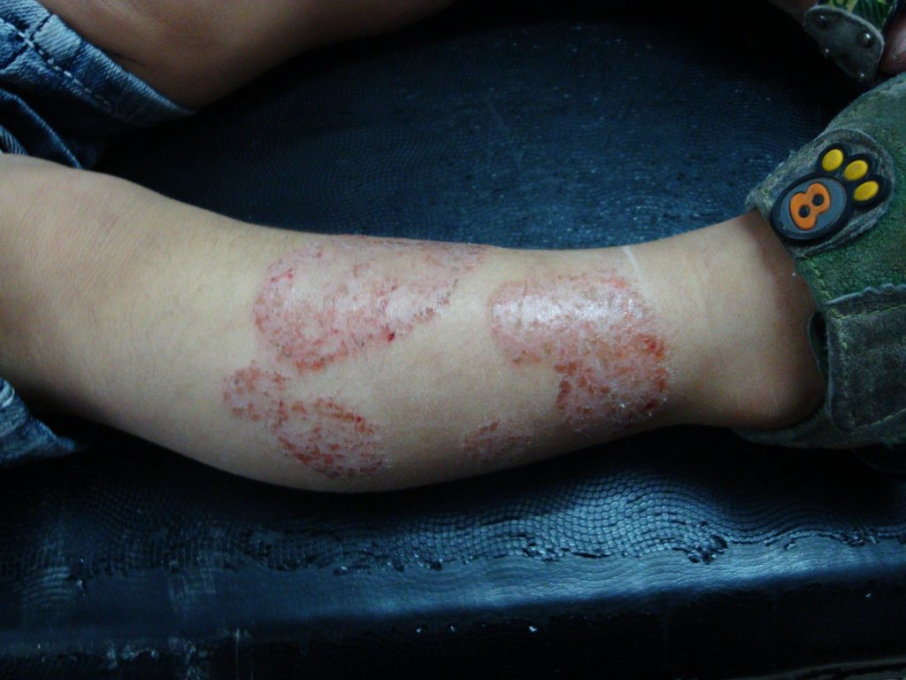 Bilateral red scaly excoriated nummular plaques involved both legs of 2 months duration. Family history of atopy was positive.