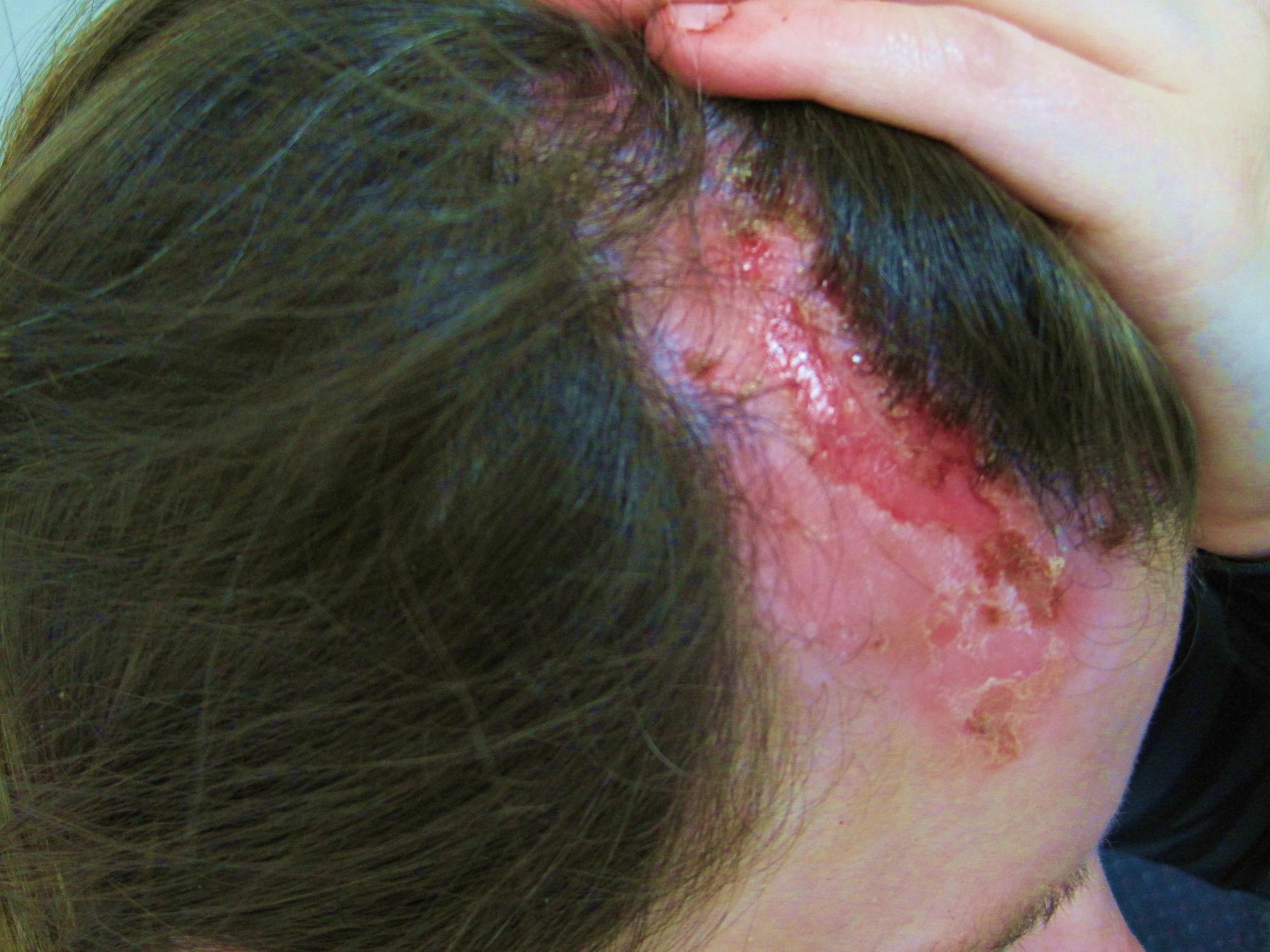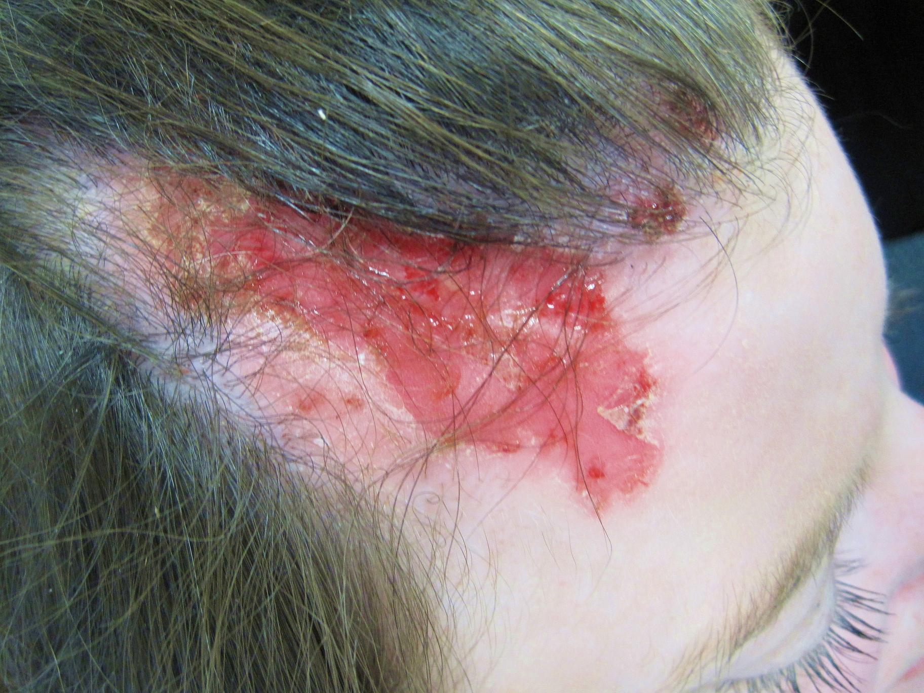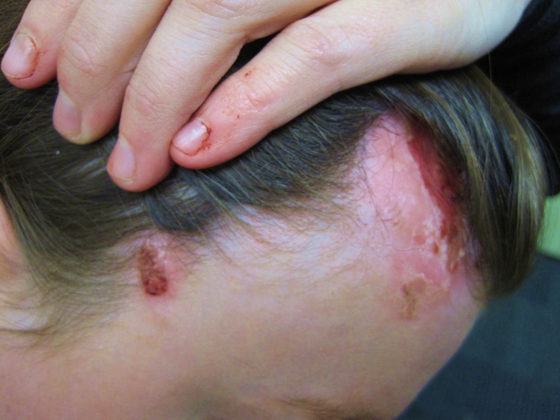 It is painful now, she looks mildly anxious, finger biting marks are noted, she does not have other PMH or allergies. Dx: Dermatits artifacta. Rx: I Started her straight away on prednisolone short course for a few days and oral flucloxacillin, advised her to wear a hat until recovers, educated about the condition and about the temporarily mechanical alopecia, ?trichotillomania, referred for counselling, she rejected psychiatric Rx. I took photos before and after treatment (one week in between) was good improvement. photos in order.